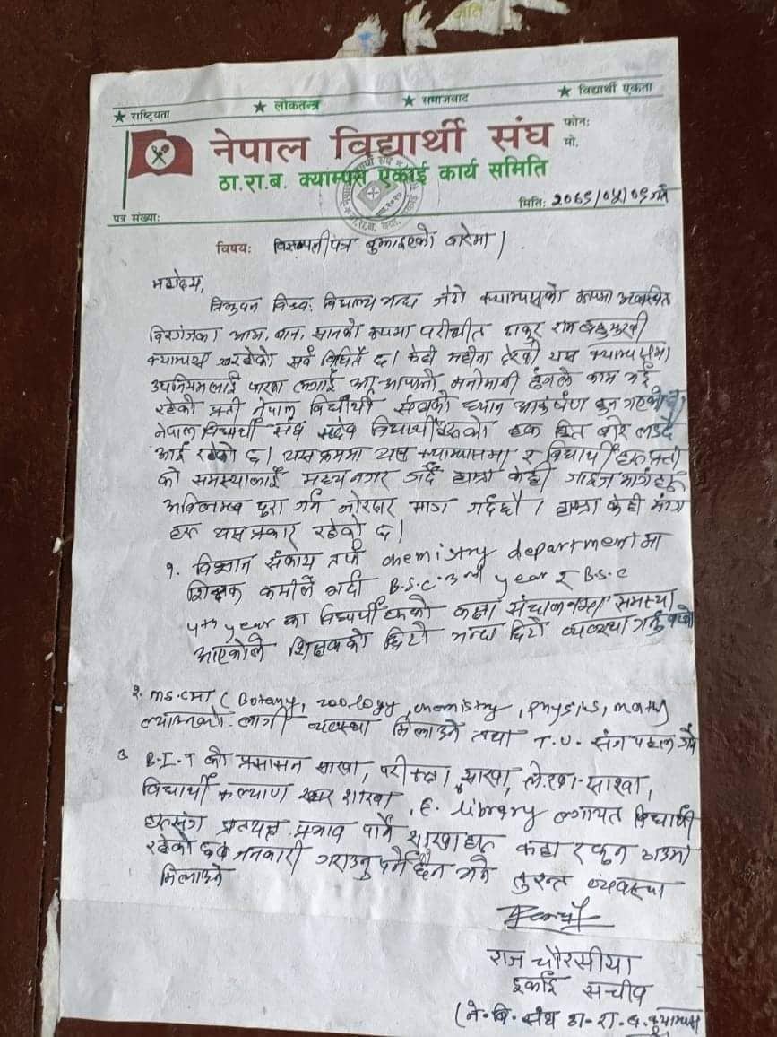 नेपाल विद्यार्थी संघ ठाराब एकाइद्वारा कक्षा सञ्चालन गर्न माग वीरगंज, ९ भदौ । नेपाल विद्यार्थी संघ ठाराब क्याम्पस एकाइ कार्य समितिले आज क्याम्पस प्रशासन समक्ष ज्ञापनपत्र बुझाएको छ । क्याम्पसमा मनोमानी ढंगले काम भइरहेका प्रति ध्यानाकर्षण गर्दै विद्यार्थीहरुको माग सम्बोधन गर्न माग गरिएको छ । विज्ञान संकायतर्फको केमिस्ट्री डिपार्टमेन्टमा शिक्ष्Fक कमीले गर्दा बिएससी तेस्रो वर्ष र चौथौ वर्षका विद्यार्थीहरुको कक्षा सञ्चालनमा समस्या आएकोले शिक्षकको छिटोभन्दा छिटो व्यवस्था गर्नुपर्ने माग गरिएको छ । त्यसैगरी दोस्रो बुंदे मागमा एमएससीमा बोटनी, जुलोजी, केमिस्ट्री, फिजिक्स, म्याथ ) ल्याउनको लागि व्यवस्था मिलाउने तथा टियुसंग पहल गर्नुपर्ने, बिआइटीको प्रशासन शाखा, परीक्ष्Fा शाखा, लेखा शाखा, विद्यार्थी कल्याण शाखा, ई लाइबेरी लगायत विद्यार्थीहरुसंग प्रत्यक्ष प्रभाव पार्ने शाखाहरु कहां र कुन ठाउंमा रहेका छ जानकारी गराउनुपर्ने माग गरिएको इकाइ सचिव राजकिशोर चौरसियाले जनाएका छन् । ज्ञापन बुझाउने कार्यक्रममा नेबि संघ जिल्ला सदस्य आदित्य साह, विद्यार्थी नेता दिपक पटेललगायतको उपस्थिति रहेको थियो ।