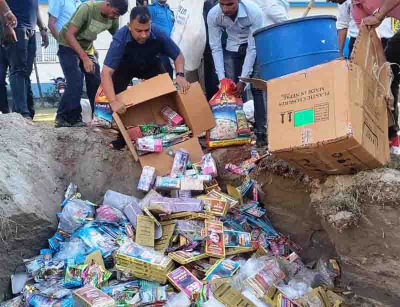 वीरगंज, ६ कात्तिक । जिल्ला प्रहरी कार्यालय, बाराले विभिन्न मिति र समयमा बरामद गरेको ५ लाख मूल्य बराबरको पटाका बरामद गरी नष्ट गरेको छ । भारतबाट नेपाल भित्रिएको ५ लाख मूल्य बराबरको पटाका आज नष्ट गरिएको जिप्रका, बाराले जनाएको छ ।
