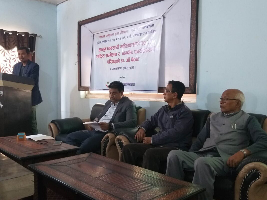 वीरगंज, ९ फागुन । मधेस प्रदेशको आठ जिल्लामध्ये चार जिल्लामा एकजना पनि कानुन व्यवसायी महिला छैनन् भने चार जिल्लामा १५ जना मात्रै कानुन व्यवसायी महिला रहेका छन् । मंगलवार उच्च अदालत परिसरमा आयोजना भएको पत्रकार सम्मेलनलाई सम्बोधनका क्रममा नेपाल वार एशोसिएसनका केन्द्रीय उपाध्यक्ष एवम मधेश प्रदेशका संयोजक अधिवक्ता सुधिर कुमार कर्णले उक्त कुरा बताउनुभयो । उनले सप्तरी जिल्लामा सबैभन्दा बढी ७ जना, धनुषामा ६ जना र पर्सामा २ जना कानुन व्यवसायी महिला रहेका छन् । बारा, रौतहट, सर्लाही र महोत्तरीमा एकजना पनि कानुन व्यवसायी महिला नरहेको उनले बताए। देशभर २२ हजार कानुन व्यवसायी भए पनि महिलाको आकर्षण किन बढेन भन्नेबारे वीरगंजमा हुने सम्मेलनमा छलफल हुने उनले बताउनुभयो । ‘पेशागत उत्कृष्टता हाम्रो प्रतिबद्धता’ भन्ने मूल नारासहित फागुन १२, १३ र १४ गते वीरगञ्जमा नेपाल वार एशोसिएशनले कानुन व्यवसायी महिलाको ३० औँ राष्ट्रिय सम्मेलन र केन्द्रीय कार्यकारिणी परिषदको ४८ औ बैठक हुने भएको छ । कर्णले मधेश प्रदेशमा कानून व्यवसायी महिलाको उपस्तिथी ज्यादै न्यून भएकोले यो सम्मेलनबाट मधेश प्रदेशमा समेत कानून व्यवसायी महिलालाई पेशा प्रति आकर्शित गर्न र स्थापित गर्न महŒवपुर्ण भूमिका खेल्ने जानकारी दिनु भयो । वीरगञ्जमा पहिलो पटक आयोजना हुन लागेको यो कार्यक्रममा देशभरिका ७०० भन्दा बढी कानून ब्यवासायी महिला सहभागी हुने अनुमान गरिएको अधिवक्ता कर्णको भनाई छ । अधिवक्ता कर्णका अनुसार फाल्गुन १२ बिहान ८ बजे वीरगंजको घन्टाघरबाट प्रभातफेरी शुरू भई आदर्शनगर हुदै टाउन हल पार्टी प्यालेस सम्म जाने र सम्मेलनको समुद्घाटन प्रमुख अतिथि सम्माननीय का.मु. प्रधान न्यायाधिशबाट हुनेछ । साथै १२ गते ११ बजे देखि सम्मेलन शुरू भई १३ गते १ बजे वीरगञ्ज घोषणापत्र जारी गरि समापन हुनेछ । त्यस्तै फाल्गुन १३ गते १ बजे देखि नेपाल वार एशोसिएसनको ४८ औ केन्द्रीय कार्यकारिणी परिषद्को बैठकको उदघाटन संघिय कानून न्याय तथा संसदीय मामिला मन्त्री माननीय धुर्ब बहादुर प्रधानबाट हुने जानकारी दिनु भयो । उक्त कार्यक्रममा अधिराज्यबाट करिब ८०० जना कानून व्यवसायीहरूको सहभागीता हुनेछ । सो परिषदको बैठकमा न्यायालय सुद्रीदिकरणको बिषयमा कानून व्यवसायीको पेशागत दक्षता बृधिको सम्बन्धमा बिधान संसोधनको सम्बन्धमा छलफल हुने अधिवक्ता कर्णले जनाकारी गराउनु भयो । पत्रकार सम्मेलनको संचालन उच्च अदालत वार एशोसिएसन वीरगञ्ज अध्यक्ष अधिवक्ता बिशाल चौधरीले गर्नु भएको थियो भने सो पत्रकार सम्मेलनमा पर्सा जिल्ला अदालत वार एशोसिसनका अध्यक्ष अधिवक्ता कमल मोहन पोखरेल, बरिठ अधिवक्ता दिपक राज भण्डारी, पर्सा वार पुर्व अध्यक्ष 