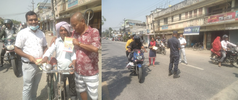 वीरगंज, २७ वैशाख/ सामुदायिक सेवा केन्द्र श्रीपुर, मुर्लीले सचेतनामूलक पोस्टर पर्चा वितरण गरेको छ । समुदाय प्रहरी साझेदारी कार्यक्रम अन्तर्गत सामुदायिक सेवा केन्द्र श्रीपुर, मुर्लीले वीरगंजको मुख्य सडकमा विपद समयमा सचेत रहौं र सुरक्षित रहौं नाराका साथ २०५ जनालाई जनचेतनामूलक पर्चा पम्पलेट वितरण गरेको हो । केन्द्रका सचिव कुलनारायण (दिलीप) प्रधानको अध्यक्ष्Fतामा भएको कार्यक्रममा प्रहरी वरिष्ठ हवल्दार गणेशप्रसाद यादवलगायतले सचेतनामूलक पर्चा, पोस्टर वितरण गरेका थिए ।