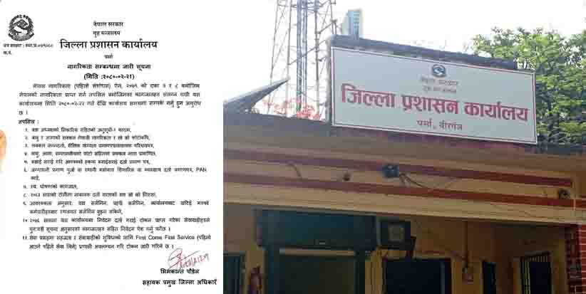 आइतवारबाटै नयाँ नागरिकता ऐनअनुसार नागरिकता वितरण गर्न भनिए पनि पर्सा, बारा र रौतहतमा सोमवारदेखि मात्रै नागरिकता वितरण गरिने सम्बन्धीत जिल्ला प्रशासन कार्यालयले जनाएका छन् । जिल्ला प्रशासन कार्यालय, पर्साले सूचना जारी गरी नयाँ नागरिकता ऐनअनुसार सोमवारबाट नागरिकता वितरण गरिने जनाएको छ । नेपाल नागरिकता (पहिलो संशोधन) ऐन, २०७९ को दफा ३ र ८ बमोजिम नेपालको नागरिकता प्राप्त गर्न चाहिने कागजातहरू संलग्न राखी जेठ २२ गते कार्यालयमा सम्पर्क राख्न जिल्ला प्रशासन कार्यालयले भनेको छ।