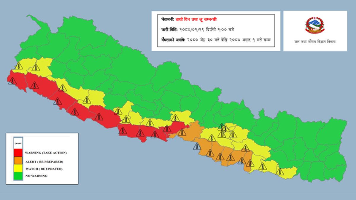 साथै बागमती प्रदेशको तराईका भू–भाग र मधेस प्रदेशको पश्चिमी भू–भागमा थोरै तापक्रम घटे पनि अत्यधिक गर्मीको सम्भावना यथावत रहने देखिएको छ । महाशाखाले ती भू–भागहरूमा आगामी चार दिन (जेठ ३० देखि असार १ गते) सम्म तातो हावा तथा लूको सम्भावना यथावत रहने देखिएकाले सोबाट बच्न आवश्यक सतर्कता अपनाउन हुन अनुरोध छ ।