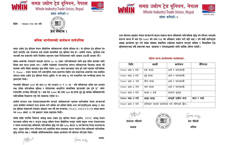 वीरगंज, ३२ साउन । समग्र उद्योग ट्रेड युनियन नेपाल (ह्वीन) ले चरणबद्ध आन्दोलनको कार्यक्रम घोषणा गरेको छ ।