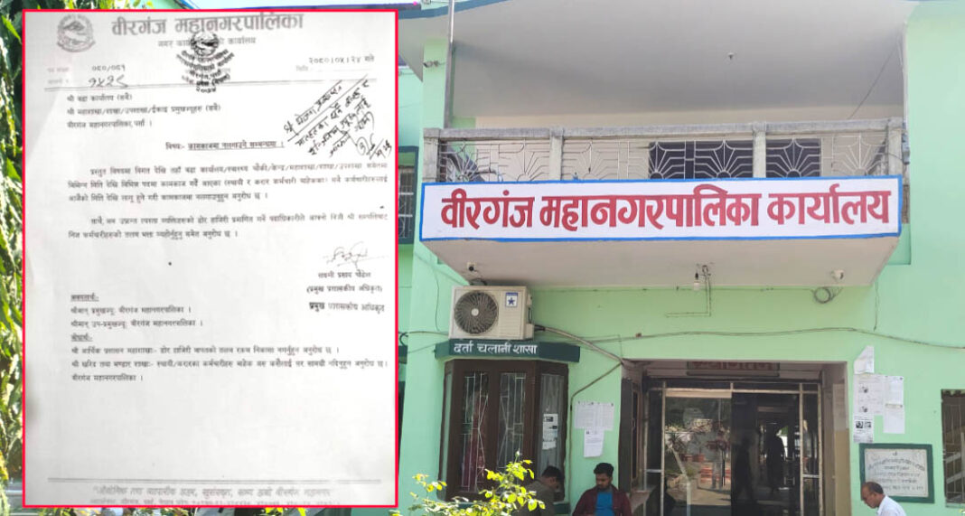जथाभावी कर्मचारी भर्ना गरेको भन्दै वीरगञ्ज महानगरपालिकाका प्रमुख प्रशासकिय अधिकृत लक्ष्मी प्रसाद पौडेललाई सतर्कता केन्द्रले कार्वाही गर्न अख्तियार दुरुपयोग अनुसन्धान आयोगलाई पत्राचार गर्ने सुइको पाएपछि पौडेलले आज दैनिक ज्यालादारी र डोर हाजिरमा काम गर्दै आएका कर्मचारीलाई सेवाबाट बर्खास्त गर्नु भएको हो ।