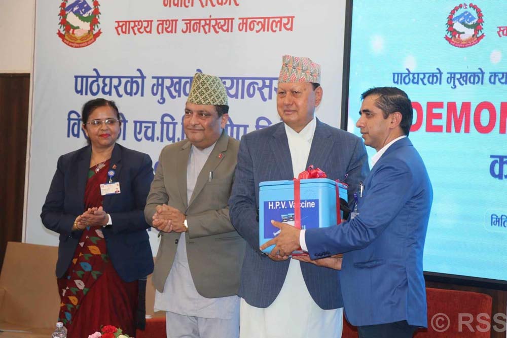 यसअघि सरकारले सन् २०१६÷१७ मा पाठेघरको मुखको क्यान्सरविरुद्धको खोप नमूनाका रूपमा चितवन र कास्कीमा सञ्चालन गरेको थियो । ‘ह्युमन प्यापिलोमा भाइरस’ले गर्दा हुनसक्ने महिलाको पाठेघरको मुख, यौनाङ्गको क्यान्सर तथा यौनाङ्गमा हुने मुसाबाट खोपले बचाउँछ । नेपालमा महिलालाई पाठेघरको मुखको क्यान्सर सबैभन्दा बढी लाग्ने गर्दछ । सरकारले गत असारमा किशोरीलाई पाठेघरको मुखको क्यान्सरविरुद्धको खोप लगाउनका लागि २० हजार मात्रा खोप चीनबाट ल्याएको थियो । आज पहिलो मात्रा दिइने र छ महिनापछि दोस्रो मात्रा खोप दिइनेछ ।