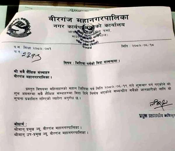 वीरगंज, १८ असाेज । जिउतिया पर्वकाे अवसरमा वीरगंज महानगरपालिकामा रहेका विद्यालयहरुमा भाेलि शुक्रबार विदा दिइएको छ ।
