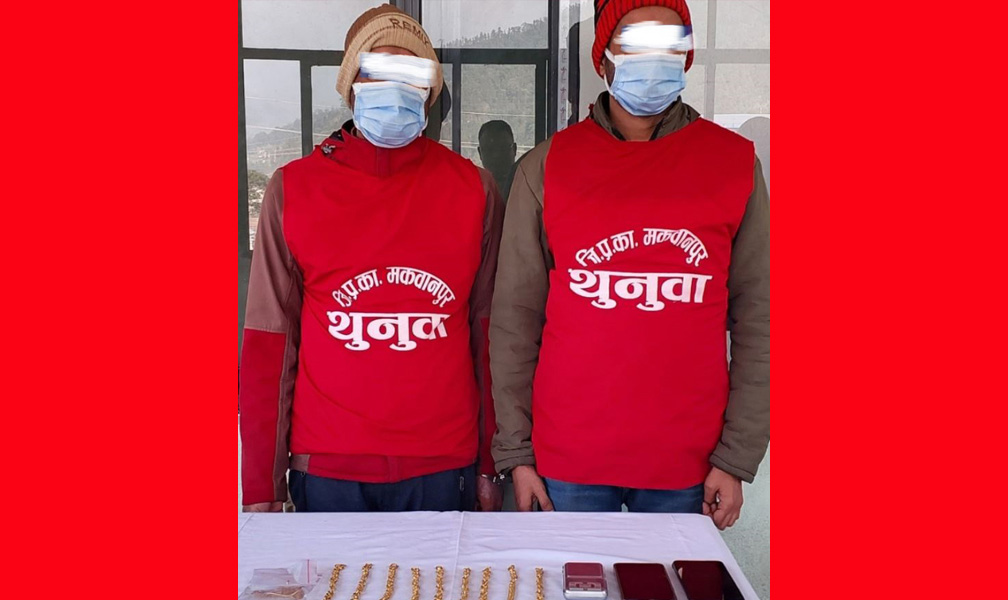 काठमाडौं २९ मंसिर । आधा किलो सुनसहित प्रहरीले दुईजना युवकलाई पक्राउ गरेको छ। हेटौंडा उपमहानगरपालिका-१५ रातोमाटेस्थित चेक प्वाइन्टबाट शुक्रबार बिहान प्रहरीले दुईजनालाई पक्राउ गरेको हो।