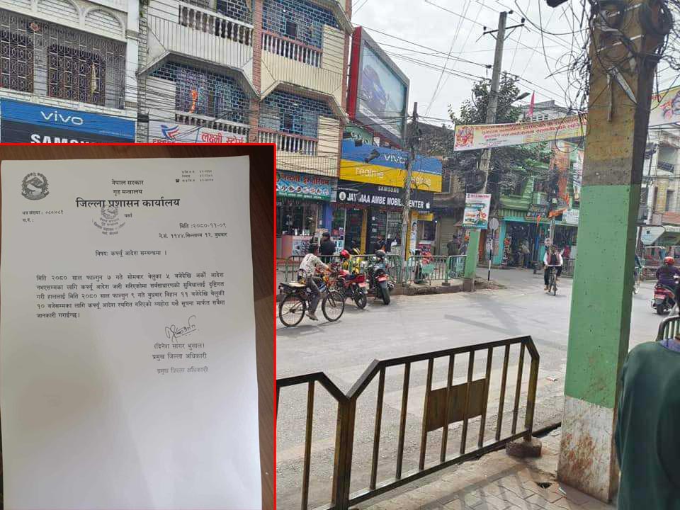 आज बिहान प्रमुख जिल्ला अधिकारी दिनेशसागर भुसालले विज्ञप्ति जारी गरी फागुन ७ गते बेलुका ५ बजेदेखि अर्को आदेश नभएसम्मका लागि कफर्यु आदेश जारी गरिएकोमा सर्वसाधारणको सुविधालाई दृष्टिगत गरी बुधवार बिहान ११ बजेदेखि बेलुका १० बजेसम्मको लागि कफर्यू आदेश स्थगित गरेको जनाएको छ ।