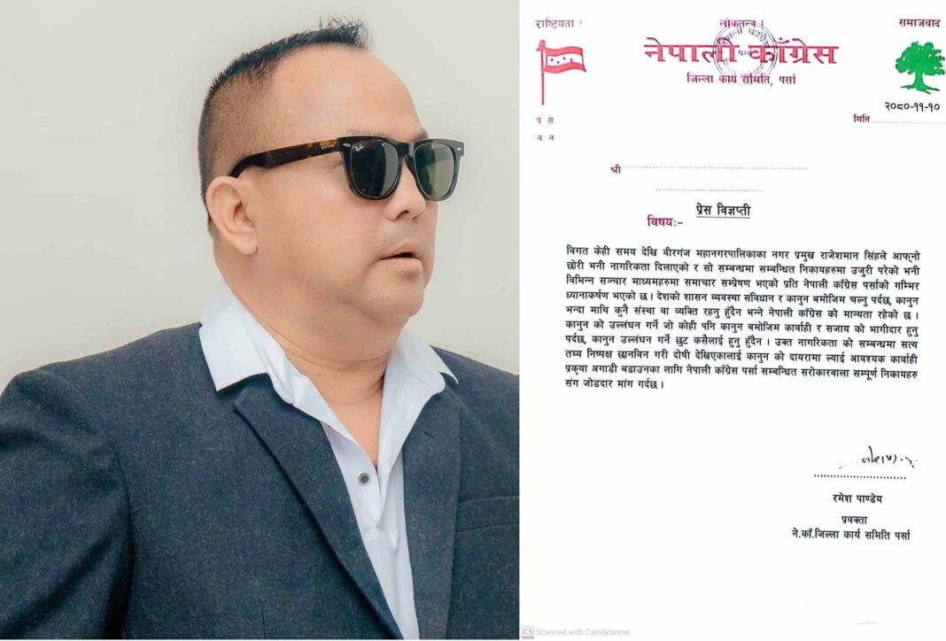वीरगंज, १२ फागुन । नेपाली काङ्ग्रेस पर्सा द्वारा बिरगंज महानगर का मेयरलाई कानुन बमोजिम कार्बाही गर्न माग गरेको छ । पर्सा काङ्ग्रेसले हिजो एक प्रेस बिज्ञप्ति जारी गर्दै अरुको छोरी लाई किर्ते जन्म दर्ताको आधारमा नक्कली बाबू बनी नागरिकता र राहादानी बनाइ दिएका बिरगंजका मेयर राजेश मान सिंह लाई कानुन बमोजिम कारबाही गर्न माग गरेको हो । पछिल्लो एक महिना यता मेयर सिंहले भट्टराई थरकि एक युवती लाई नक्कली बाबू बनी रुबिना श्रेष्ठको नाममा किर्ते जन्म दर्ता बनाइ नागरिकता र रहादानी समेत बनाइ दिएको खुले पछि उनी बिबादमा छन ।
