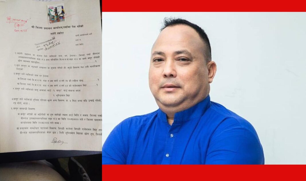 वीरगञ्ज – वीरगञ्ज महानगरपालिकाका मेयर राजेशमान सिँह बिरुद्ध सरकारी कागज किर्तेको जाहेरी पर्सा प्रहरीमा दर्ता भएको छ।बिहीबार उनी बिरुद्ध जाहेरी दर्ता भएको हो।मेयर सिँहसहित उनी छोरी भनिएकी रुवीना श्रेष्ठ,रिता भटराई र भिखारी राय बिरुद्ध पनि सरकारी कागज किर्तेको जाहेरी दर्ता भएको पर्साका प्रहरी प्रबक्ता एवम् डिएसपी कुमार बिक्रम थापाले जानकारी दिए।