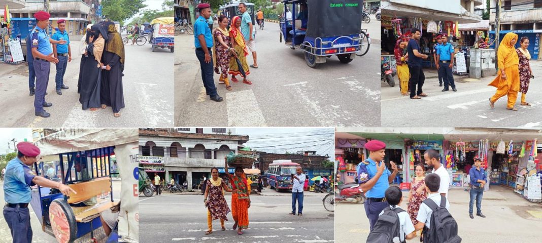 वीरगंज महानगरपालिका वडा नं.११ मुर्ली चौकमा पैदल यात्री, साईकल चालकहरूलाई जेब्रा क्रसिङ गर्दा दायाँ बायाँ हेरेर मात्र बाटो क्रस गर्न, ट्राफिक संकेत, ट्राफिक लाईटको बिषयमा सम्झाई बुझाई सचेत गरिएको थियो ।