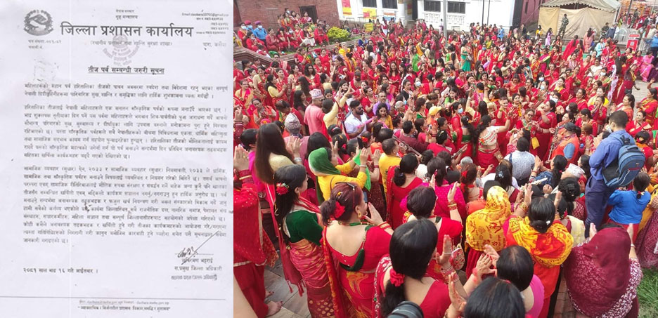 सहायक प्रमुख जिल्ला अधिकारी छविरमण भट्टराईले आज जारी गरेको सूचना अनुसार पर्व मनाउने सन्दर्भमा अनावश्यक तडकभडक र फजुल खर्च नियन्त्रण गरी असल संस्कारको विकास गर्दै जानु हामी सबैको कर्तव्य भएकोले यस कार्यमा जिल्लास्थित सबै राजनीतिक दल, नागरिक समाज, पेशागत संघ संस्थाहरू, सुधारकर्मीहरू, महिला सञ्जाल तथा सम्पूर्ण जिल्लावासीहरूबाट सहयोगको अपेक्षा गरिएको छ। कोही कसैले अनावश्यक तडकभडक र खर्चिलो हुने गरी तीजका कार्यक्रमहरूको आयोजना गरे–गराएमा त्यस्ता गतिविधिहरूको निगरानी गरी कानुन बमोजिम कारबाही हुने सहायक प्रजिअ भट्टराईले जनाएका छन् । सूचनामा हरितालिका तीजलाई नेपाली महिलाहरूले एक सनातन साँस्कृतिक पर्वको रूपमा मनाउँदै आएका छन् ।