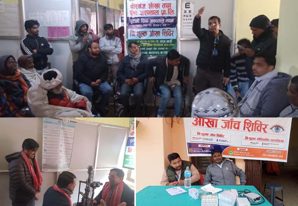 वीरगंज, १९ माघ । वीरगंज आँखा तथा दाँत अस्पताल तथा रोटरी क्लब अफ वीरगंज मेट्रोपोलिसको आयोजनामा शनिवार फेटा गाउँपालिका वार्ड–३ को स्वास्थ चौकीमा निःशुल्क आँखा शिविर सम्पन्न भएको छ । फेटा गाउँपालिकाको सहजीकरणमा भएको शिविरमा २३७ जनाले निःशुल्क सेवा लिएका थिए । शिविरमा ७३ जनामा मोतियाबिन्दु भेटिएको र उनीहरुको वीरगंज आँखा तथा दाँत अस्पतालमा निःशुल्क सल्यक्रिया गरिने तथा अस्पतालसम्म जानलाई निःशुल्क यातायातको व्यवस्था भएको अस्पतालको व्यवस्थापक आसीफ अलिले जानकारी दिनुभयो । शिविरमा आवश्यक परेको बिरामीलाई निःशुल्क औषधि पनि वितरण गरिएको थियो । कार्यक्रममा फेटा गाउँपालिकाका अध्यक्ष, अस्पतालकाा मेडिकल डाइरेक्टर डा चन्दन बनर्जी, रोटरी क्लब अफ वीरगंज मेट्रोपोलिसका प्रेसिडेन्टलगायतको सहभागिता थियो ।