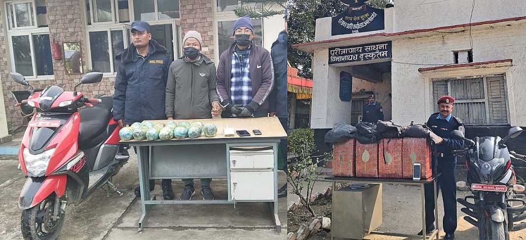 वीरगंज, २९ माघ/ ५५ किलो ९० ग्राम गाँजा, चरेससहित तीनजनालाई बारा प्रहरीले पक्राउ गरेको छ । माघ २८ गते राति १०ः३० बजे इलाका प्रहरी कार्यालय, अमलेखगंजले जीतपुरसिमरा उपमनपा–२१ अमलेखगंजचोकमा चेकजाँच गर्दा वीरगंज जाँदै गरेको नम्बर नखुलेको मोटरसाइकल चालकले दुई पोकामा रहेको २८ किलो गाँजा र मोटरसाइकल फालेर फरार भएको प्रवक्ता सापकोटाले बताए । यसैगरी, आज बिहान ९ः३० बजे नेपाली नम्बरको पल्सर मोटरसाइकलमा सवार दुईजनाले प्रहरीलाई देखेर दुईवटा झोला फालेर भागेकोका थिए । दुईवटा झोलाबाट २७ किलो ९० ग्राम गाँजा बरामद भएको सापकोटाले बताए । यसैगरी आज बिहान प्रहरी चौकी पथलैयाले नेपाली नम्बरको स्कुटीबाट अफिमजस्तो देखिने १३ किलो वस्तु बरामद गरेको छ । प्रहरीले स्कुटी रोक्न खोज्दा नरोकी भागेको र पिछा गर्दैजाँदा सूर्य नेपाल नजीकैबाट स्कुटी र मकवानपुर जिल्ला, मनहरी गापा–६ बस्ने सूर्यबहादुर मोक्तान र भीमबहादुर मोक्तानलाई पक्राउ गरेको प्रवक्ता सापकोटाले बताए । स्कुटीबाट १३ किलो अफिमजस्तो देखिने वस्तु बरामद भएको र घटनाबारे छानबिन भइरहेको प्रवक्ता सापकोटाले बताएका छन् ।
