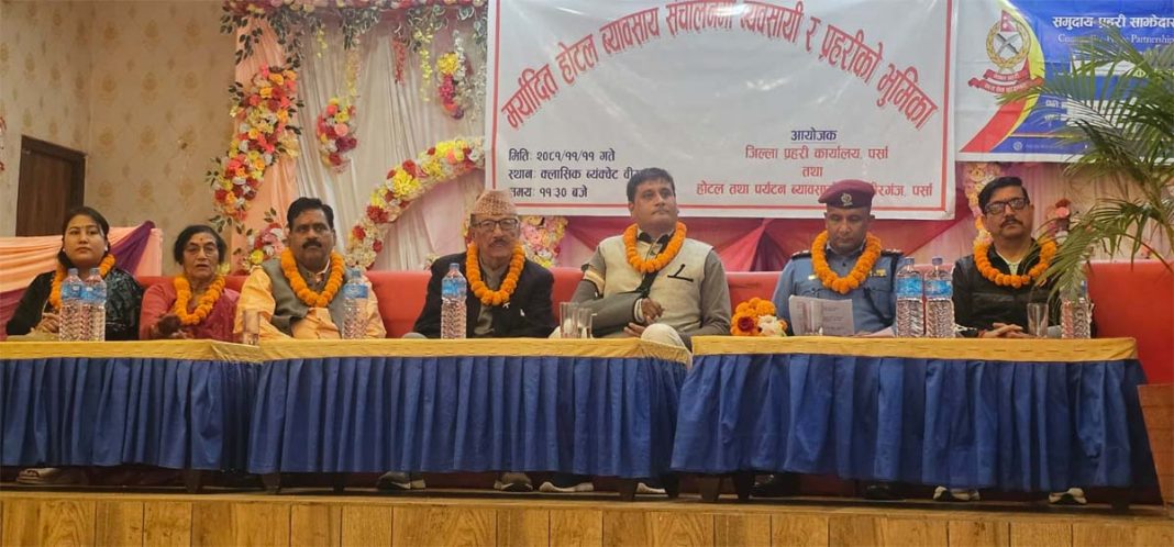 वीरगंज, ११ फागुन । होटल तथा मसाज केन्द्रहरूलाई ब्यवस्थित र मर्यादित बनाउन जिल्ला प्रहरी कार्यालय र होटल तथा पर्यटन व्यवसायी संघ, पर्साले संयुक्त रूपमा पहल शुरू गरेका छन् । आज स्थानीय क्लासिक ब्यान्क्वेटमा उक्त अभियानको पहिलो चरणमा वीरगंजका प्रायः सम्पूर्ण होटल एवं स्पाका प्रोप्राइटर र प्रबन्धकहरूको उपस्थितिमा जिल्ला प्रहरी कार्यालय पर्सा र होटल तथा पर्यटन व्यवसायी संघ पर्साको संयुक्त आयोजनामा ‘मर्यादित होटल ब्यवसाय सञ्चालनमा ब्यवसायी र प्रहरीको भूमिका’ विषयक अन्तरक्रिया कार्यक्रमको आयोजना गरिएको छ । कार्यक्रममा सभापतिको आसनबाट बोल्दै होटल तथा पर्यटन ब्यवसायी संघ पर्साका अध्यक्ष हरि पन्तले होटल ब्यवसायी र प्रहरीको सहकार्य यस क्षेत्रको तमाम समस्या समाधानमा कोशेढुङ्गा साबित हुने बताए । उनले २१औं शताब्दीको प्रहरीले अनावश्यक रूपमा होटलको चोठा– कोठा चहारेर आफ्नो महत्वपूर्ण समय बर्बाद नगर्न समेत सुझाए । कार्यक्रमका प्रमुख अतिथि पर्साका प्रहरी प्रमुख, प्रहरी उपरीक्षक गौतम मिश्रले कुनै पनि होटलमा होटल ब्यवसायीहरूको प्रत्यक्ष संलग्नतामा गलत क्रियाकलाप र यौनजन्य गतिविधि नगर्न र त्यसो गरिएको भेटिएमा कारबाइको लागि तयार रहन चेतावनी समेत दिए । उनले आफू पर्सा आएपछि वीरगंजका ४ जना होटल ब्यवसायीहरूलाइ मानव बेचबिखनको मुद्दा चलाएको समेत बताएका थिए । ७० भन्दा बढी होटल ब्यवसायीहरूको उपस्थिति रहेको कार्यक्रमको ओपन फ्लोअरमा अधिकांस होटल ब्यवसायीहरूले आ आफ्नो समस्याहरू राख्ने क्रममा व्यवसायीहरूमाथी कतै–कतै अन्याय समेत भएको बताएका थिए । होटल तथा पर्यटन ब्यवसायी संघ पर्साका अध्यक्ष हरि पन्तको सभापतित्वमा सम्पन्न कार्यक्रममा रचेन्द्र सिंह थापाले स्वागत तथा दिलिप राज कार्कीले सहजीकरण गरेका थिए । कार्यक्रममा प्रहरी नायब उपरीक्षक, प्रहरी निरीक्षक र सामुदायिक प्रहरीका प्रमुखहरूको समेत उपस्थिति रहेको थियो ।