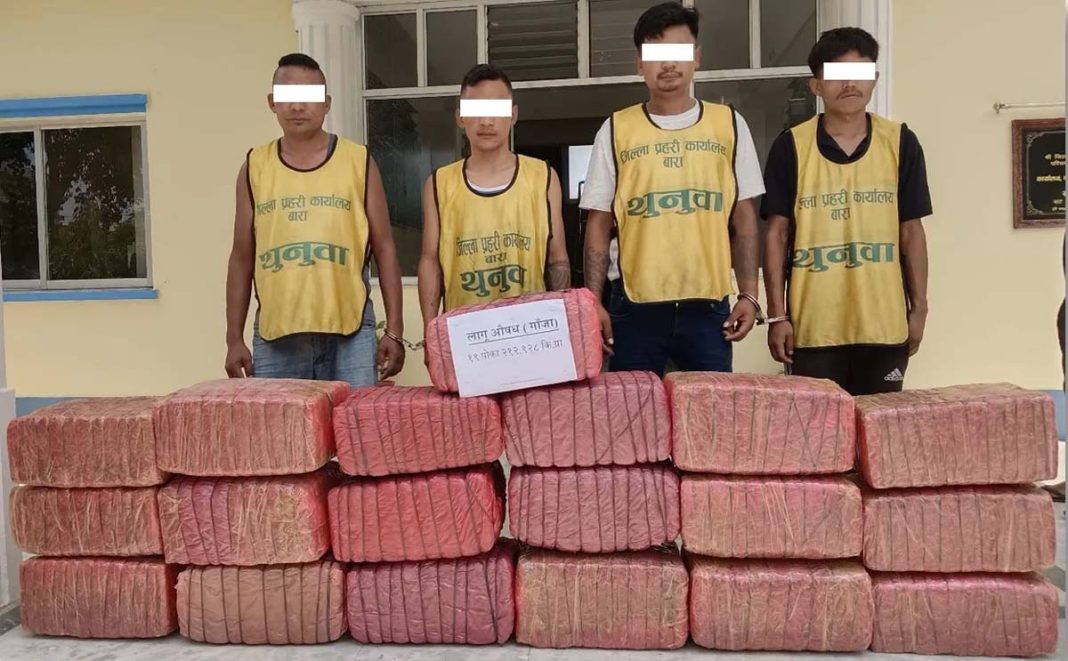 काठमाडौँ, १४ असारः परवानीपुर गाउँपालिका–५ बहुअरीबाट गाँजा २१२ किलो ९२८ ग्राम सहित ४ जना पक्राउ परेका छन् । जिल्ला प्रहरी कार्यालय बारा, इलाका प्रहरी कार्यालय प्रसौनी र इलाका प्रहरी कार्यालय सिमराबाट खटिएको प्रहरीले हेटौंडाबाट बारातर्फ आउँदै गरेको प्र.३–०१–०२४ च ४६३० नम्बरको पिकअप गाडी जाँच गर्ने क्रममा धानको भुस भरेको बोरामा लुकाई ल्याएको उक्त परिमाणको गाँजासहित उनीहरूलाई आज पक्राउ गरिएको हो ।