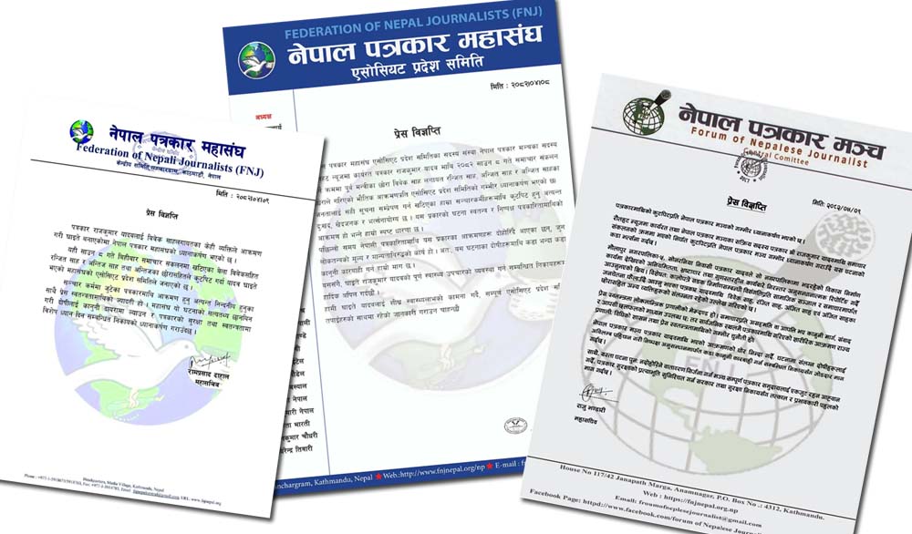रौतहटमा कार्यरत पत्रकार राजकुमार यादवमाथि समाचार संकलनका क्रममा भएको कुटपिटप्रति नेपाल पत्रकार महासंघ केन्द्रिय समिति, महासंघको एसोसिएट प्रदेश समिति र नेपाल पत्रकार मञ्चले गम्भीर ध्यानाकर्षण जनाउँदै घटनाको कडा भर्त्सना गरेका छन्।