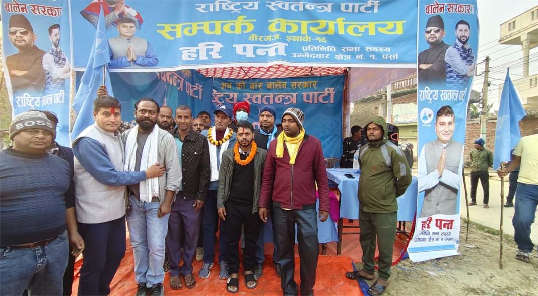 वीरगंज । राष्ट्रिय स्वतन्त्र पार्टी पर्सा सभापति एवं पर्सा क्षेत्र नं. १ का उम्मेदवार हरि पन्तले आज इनरूवामा राष्ट्रिय स्वतन्त्र पार्टीको सम्पर्क कार्यालयको उदघाटन गरेका छन् ।